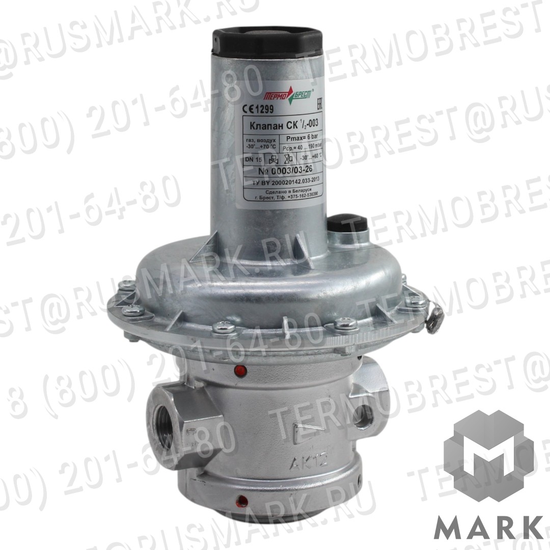 Предохранительно-сбросной клапан СК 1/2-003 производства ТЕРМОБРЕСТ (Республика Беларусь, г. Брест) предназначен для автоматического сброса избыточного давления газа в системах газоснабжения и на газопроводах перед запорно-регулирующей арматурой газогорелочных устройств .
